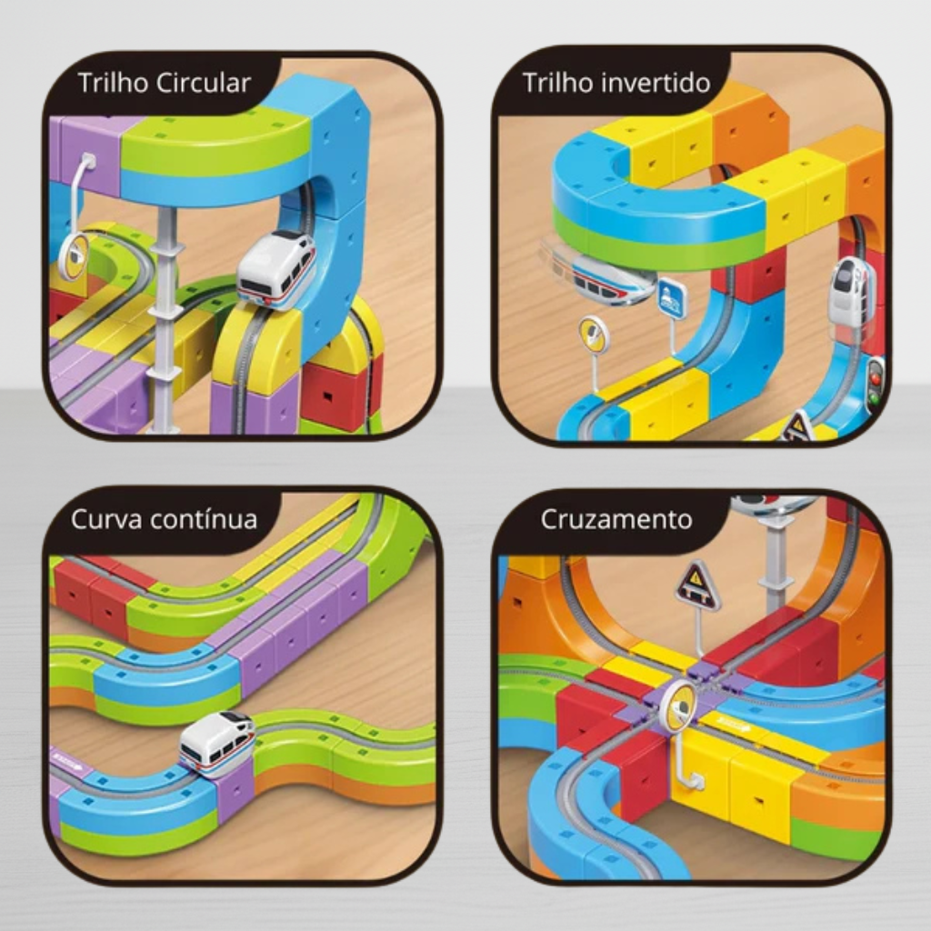 • Foco e Raciocínio Lógico: Montar o trilho e fazer o trem funcionar estimula o raciocínio espacial, o planejamento e a solução de problemas.